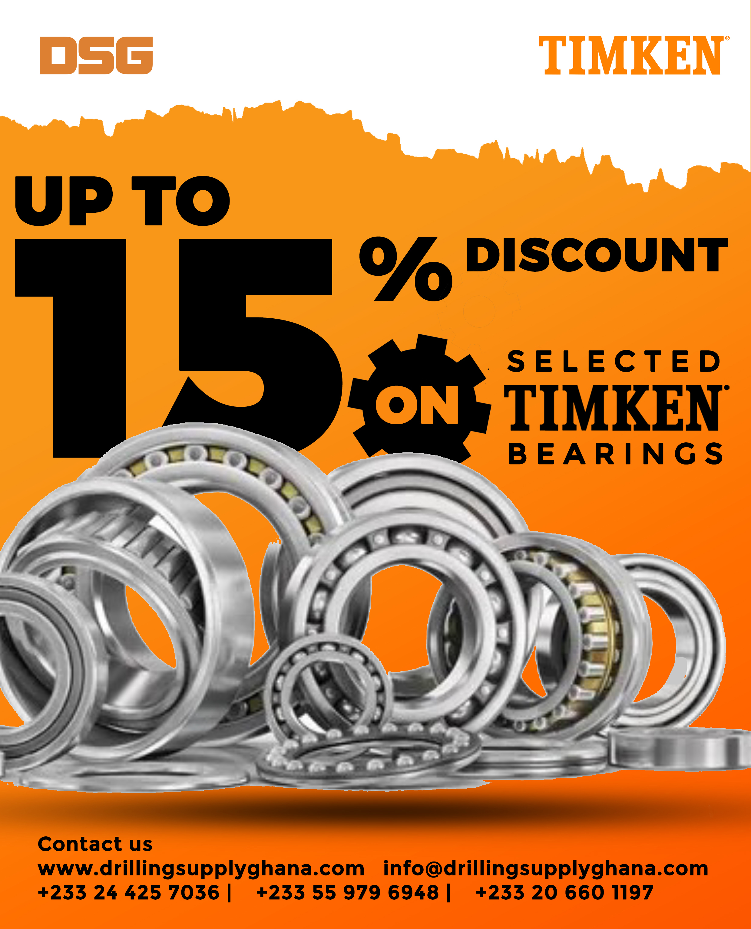 Don't miss out on this opportunity to acquire high-quality bearings at unbeatable prices. Remember, great performance and significant savings await you! Drilling Supply Ghana and Timken are your trusted partners for all your bearing requirements. Experience excellence, reliability, and affordability with our 15% discount on selected bearings. Upgrade your machinery and propel your projects to new heights. Place your order today!